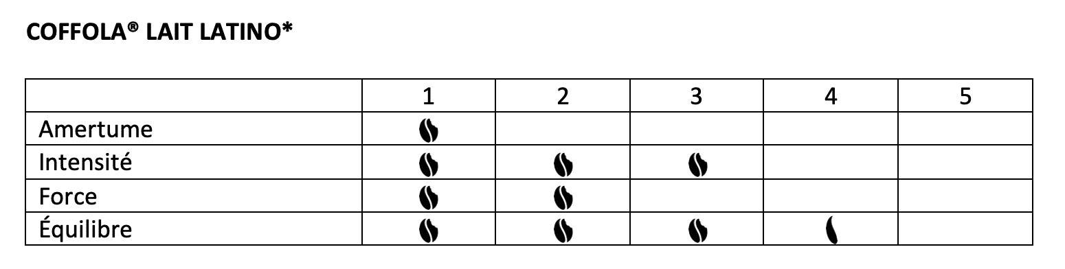 * Coffola® Latino est fabriqué avec un assemblage de grains de café Arabica et Robusta, d’Amérique du sud, d’Amérique centrale et d’Asie